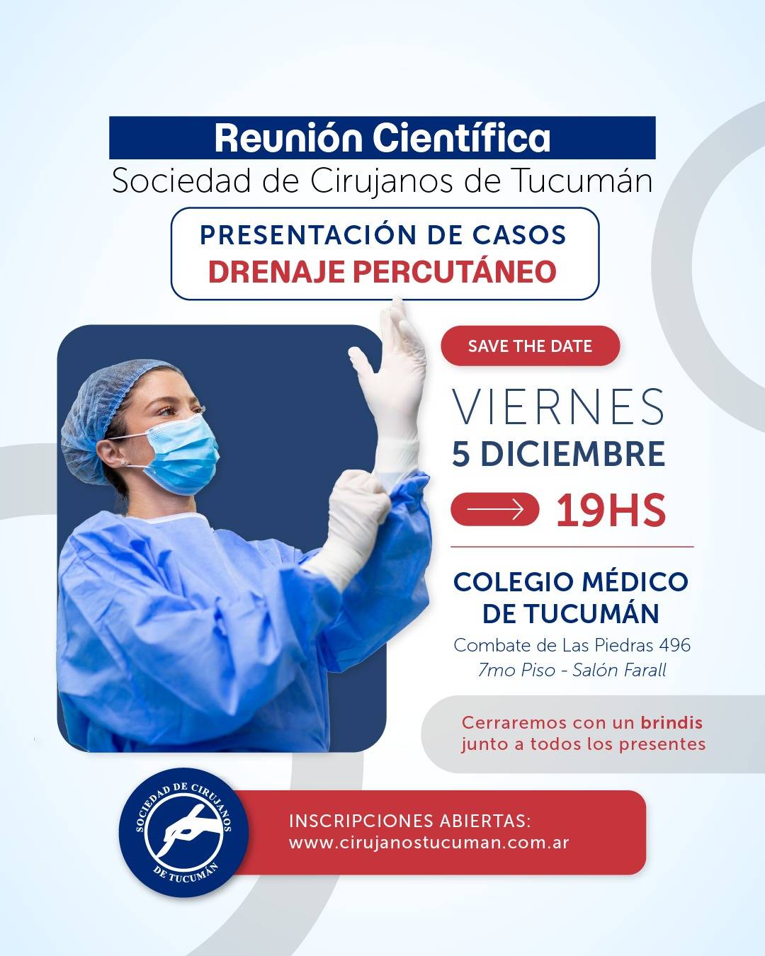 La Sociedad de Cirujanos de Tucumán invita a todos sus miembros y colegas de la comunidad médica a participar de una nueva Reunión Científica, donde se llevará a cabo una presentación de casos centrada en Drenaje Percutáneo, una de las prácticas fundamentales dentro de la cirugía y los procedimientos mínimamente invasivos.